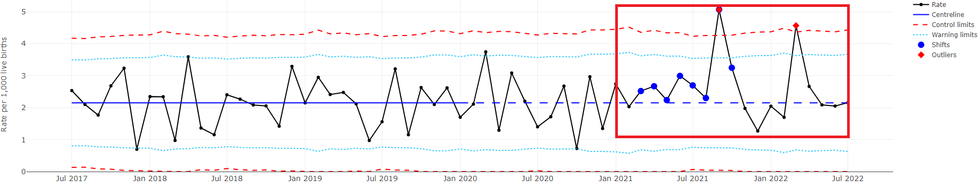 Neonatal deaths: Remember when Scotland suffered a sudden rash of neonatal deaths last September? At the time, 21 newborns had died in a month, triggering an investigation because the numbers rose above an upper control limit for the first time in four years. Neonatal deaths hit 4.9 per 1,000 live births, on a par with levels that were last seen in the late 1980s. This was an astounding phenomenon, yet the investigation yielded no cause other than disproving COVID as a culprit. But notice that the COVID shots were never investigated. Well, now the data is triggering another investigation, as at least 18 newborns died within four weeks of birth during the month of March 2022, the equivalent of 4.6 per 1,000 births. Here is the trend line from Public Health Scotland: