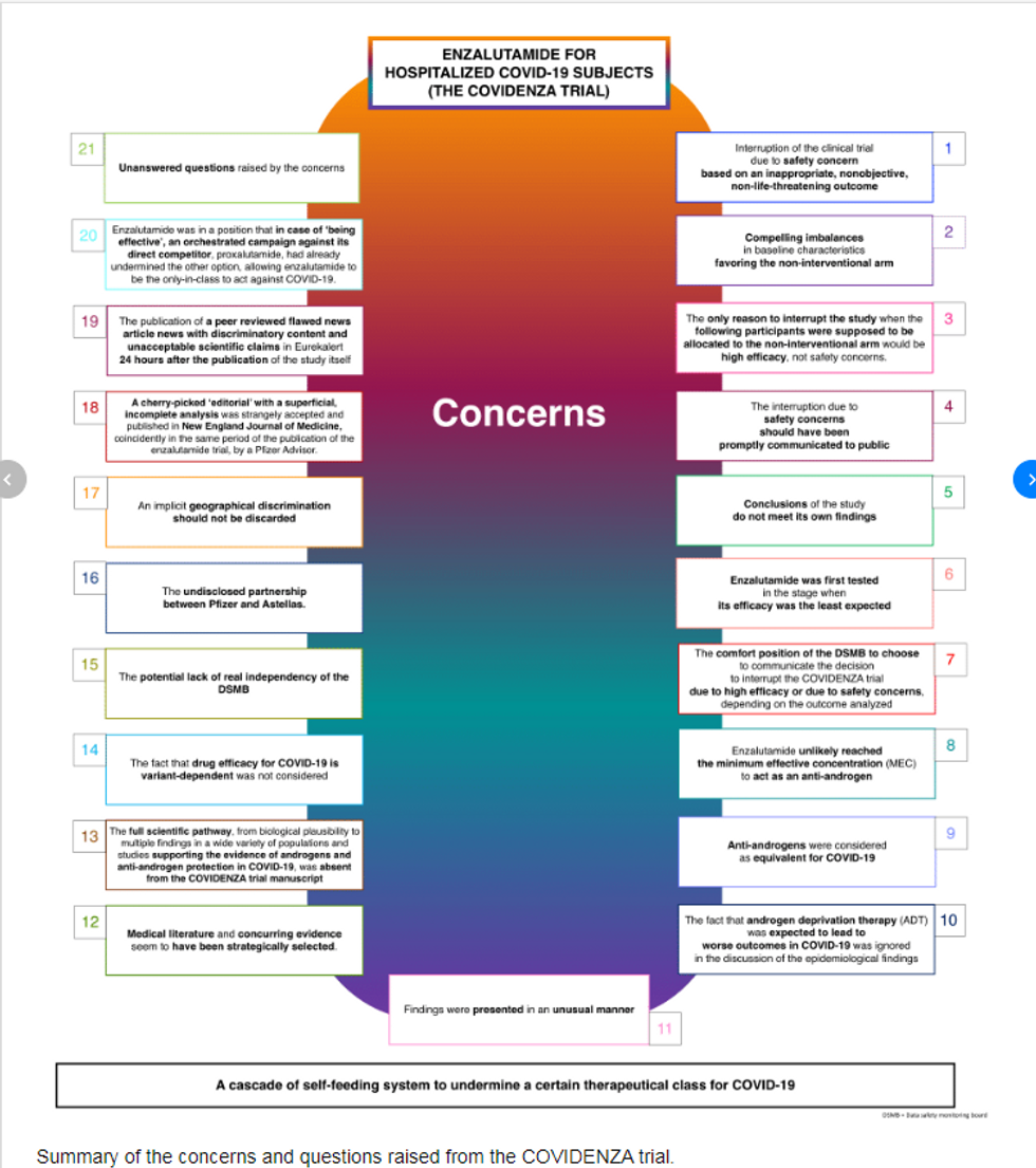 Dr. Cadegiani recently wrote a paper posted at Research Gate accusing Pfizer of backhandedly sabotaging the research on proxalutamide and anti-androgens in general. Swedish researchers published a paper on enzalutamide in Dec. 2021, a similar drug to proxalutamide, in COVID patients and claimed a conclusion showing the drug elongated hospital stay, even though there were zero deaths in the trial arm. Enzalutamide is a Pfizer-patented drug used for prostate cancer and was originally developed by a much smaller Japanese company called Astellas.