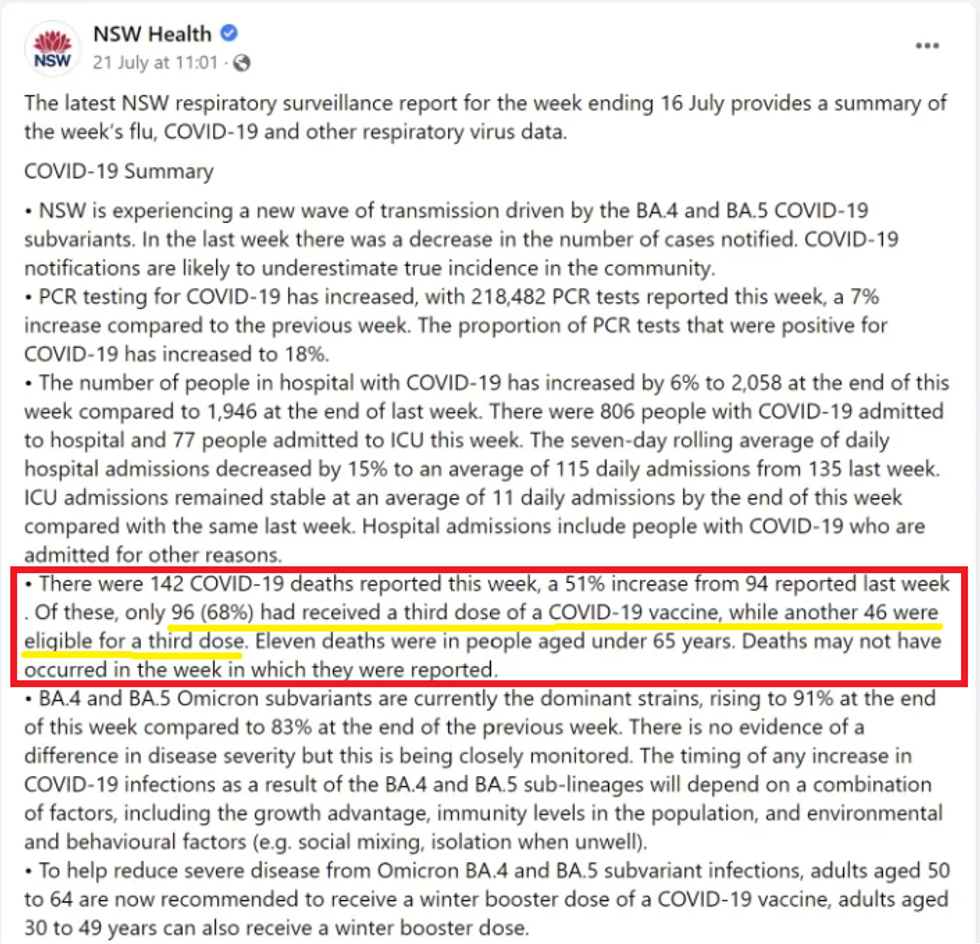 An Australian writer has collated the recent reports from New South Wales Health and found that out of 798 reported COVID deaths in the most populous Aussie state over the past eight weeks, just two of them might have been unvaccinated. For the latest full week ending on July 16, all 142 reported deaths were jabbed and 68% of them were triple-jabbed.