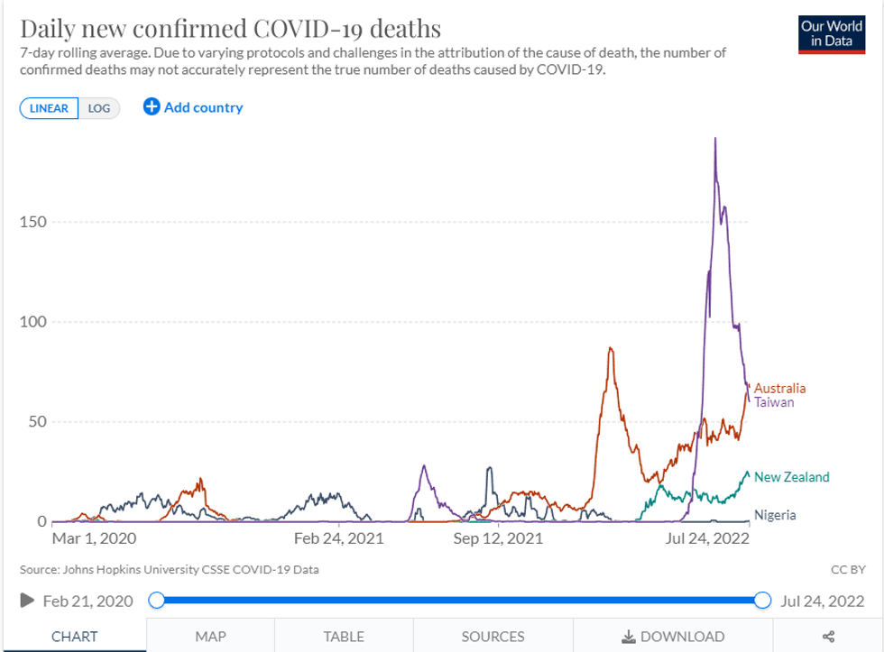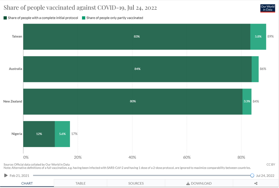 Prior to 2022, there were two parts of the world that skated through the pandemic without excess deaths: the Far East and Africa. Yet since 2022 began, the Far East has finally gotten its share of deaths, while Africa seems to be doing just fine with herd immunity. Take a look at the difference between some of the Far East countries and Nigeria, Africa’s most populous country.