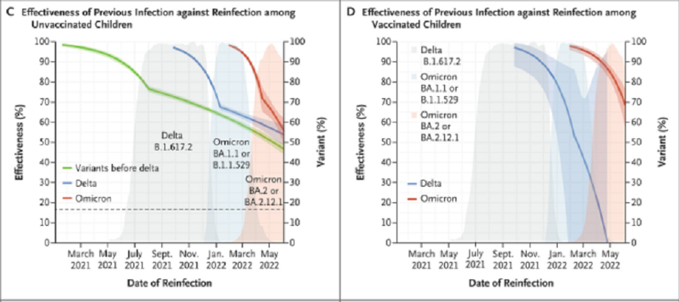 The figure on the left (C) shows the gradual waning of immunity among unvaccinated children with prior infection. The figure on the right shows a precipitous waning of immunity among children who got COVID but then got vaccinated. Among those infected in November 2021 in the vaccine group, their level of protection went down to zero within a half-year, even though they already had the virus!