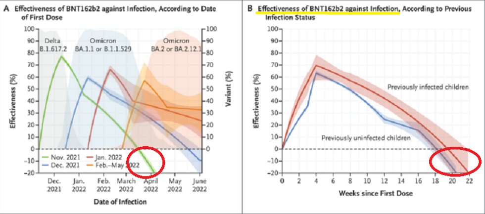 Then again, if you look at their first two figures (A and B), they appear to show negative efficacy after five months for those without prior infection and just a slightly slower decline into negative territory among the vaccinated children who already had prior infection. In other words, either way – previously infected or not – the vaccine makes the children worse off.
