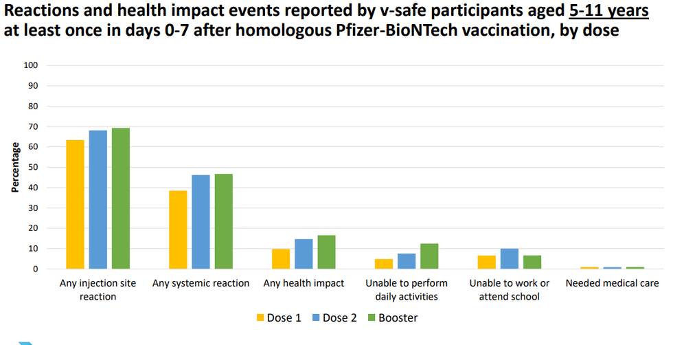 Furthermore, more than 15% of children 3-5 experienced a “health impact” from the second dose of Moderna, and anywhere from 5%-18% of children couldn’t go to school the next day, depending on the type and dose of shot. About 2% required medical care. Remember, this is for children and for Omicron, at a time when most already got the virus, but now the shot will give them up front COVID-like symptoms, possibly erase their prior immunity, thereby making them get the virus again, and exposing a certain percentage to life-altering adverse effects.
