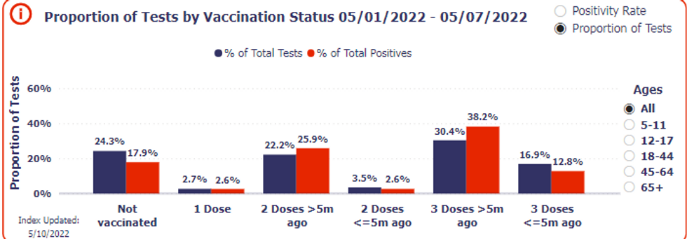 Have you ever seen a vaccine of which the more doses you get, the more likely you are to test positive? Notice how the unvaccinated account for a lesser share of cases than either their share of the population or of Walgreens-administered COVID tests. The results are based on 81,818 tests administered nationwide in Walgreens stores from May 2 through May 8.