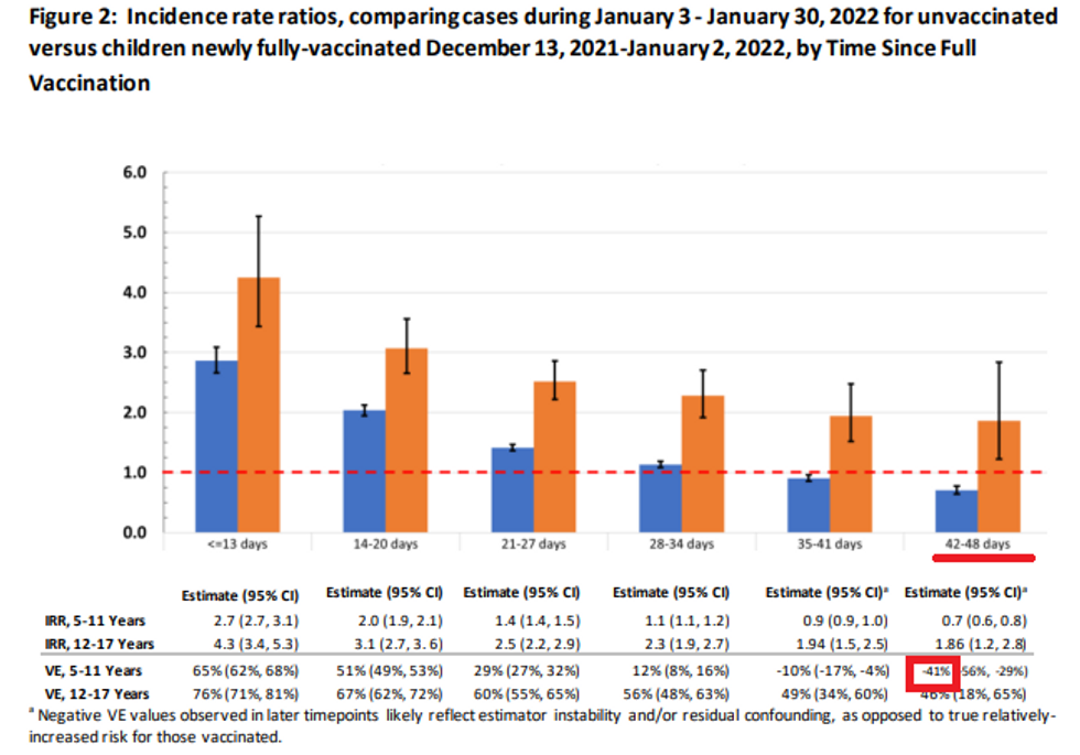 Just keep in mind that, according to the CDC, 74.2% of kids 0-11 already got natural immunity from prior infection. So not only will they fail to test kids for antibodies before injecting them, but even the remaining quarter who might be COVID-naive, they are trading risk of death and severe side effects (and pervasive mild side effects) for a possible tiny degree of very short-term efficacy against sniffles, but a long-term negative efficacy against those sniffles. A preprint study by the NY State Department of Health in February showed that the Pfizer shot was just 12% effective against the first Omicron variant for 5- to 11-year-olds, but drops to -41% after just 42 days!