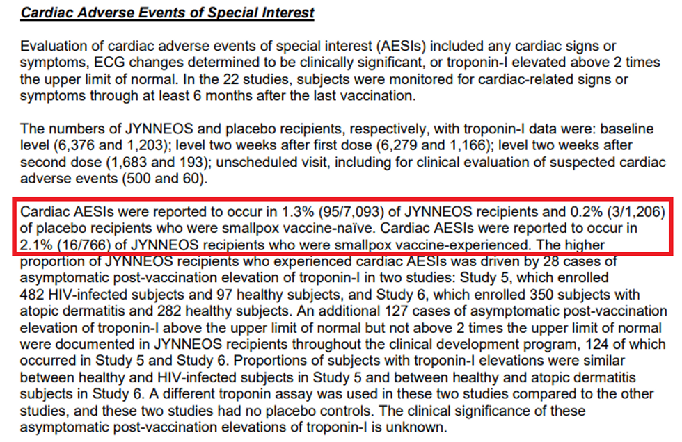 It gets worse. On the actual FDA label of the JYNNEOS vaccine (p. 6), it reveals that 1.2% of all recipients in a trial experienced “cardiac adverse events of special interest”! The number was as high as 2.1% for those who already had the smallpox vaccine at some time in their lives.