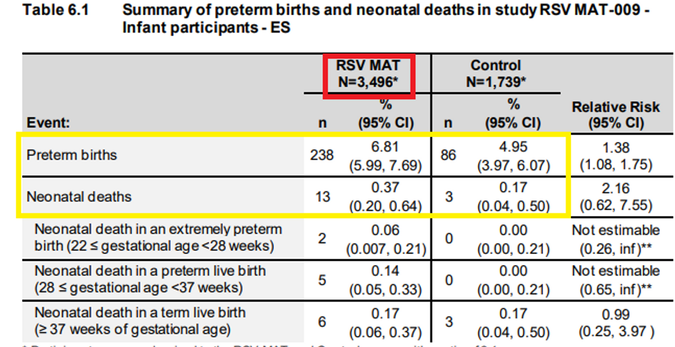 GSK was forced to halt the trial in 2022 after one death occurred in the trial, attributed to acute disseminated encephalomyelitis 22 days after vaccination, “considered by both the study investigator and FDA to potentially be related to the vaccine.” They also found a 6.8% rate of preterm births in the trial group compared to 4.9% in the placebo group. The rate of neonatal deaths was also double.