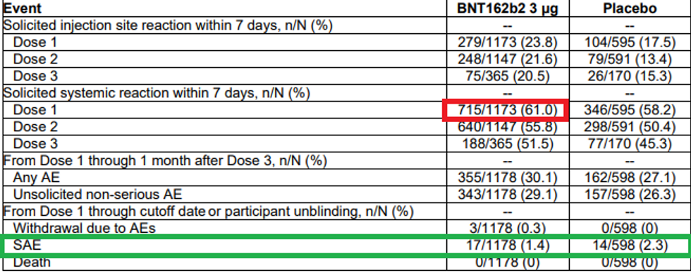 6) Now that we've established that, at best, there is no long-term benefit to these shots for anyone, much less babies, let’s go on to the adverse events. On the surface, Pfizer’s own report is an indictment of the shot’s safety. Table 21 on page 42 states that 61% of babies 6 months to 2 years old experienced a “systemic reaction within 7 days.” This means that it’s not just irritation of the injection site but something more along the lines of fever, chills, or muscle aches. Right off the bat, that should be disqualifying, because that is the upper bounds of discomfort the kids would suffer from the virus anyway. The only rebuttal to this is that almost as many placebo group patients experienced such reactions. But that in itself should be an indication there is something fraudulent with the placebo group. It’s understandable for even a saline injection to cause irritation at the injection site, but “systemic” reactions?