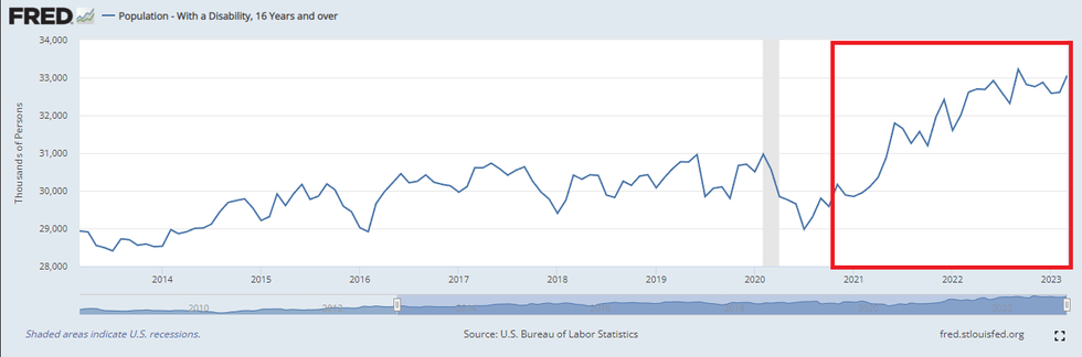 Since the rollout of the vaccines, we’ve experienced an unparalleled 14% increase in the number of reported disabled people of workforce age. More than 3 million people have been added to the ranks of the disabled, according to data from the Bureau of Labor Statistics.