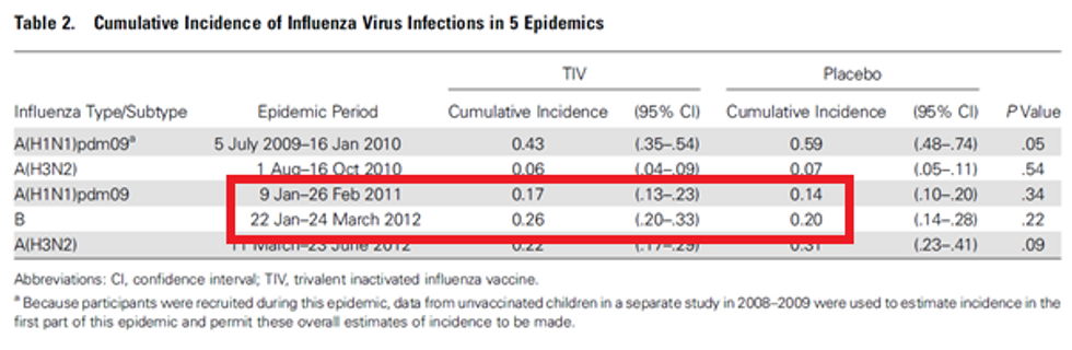 A study of infection rates in children in Hong Kong in a three-year randomized placebo-controlled vaccine study, 2009-2012, found no statistical difference or slight negative efficacy for several seasons.