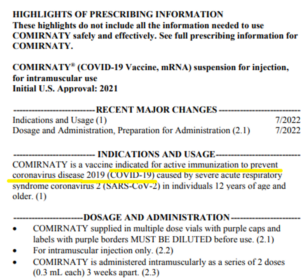 Here is the indication and usage printed on the official FDA label for the Comirnaty vaccine (yes, technically Pfizer's commercial vaccine has not been licensed yet).