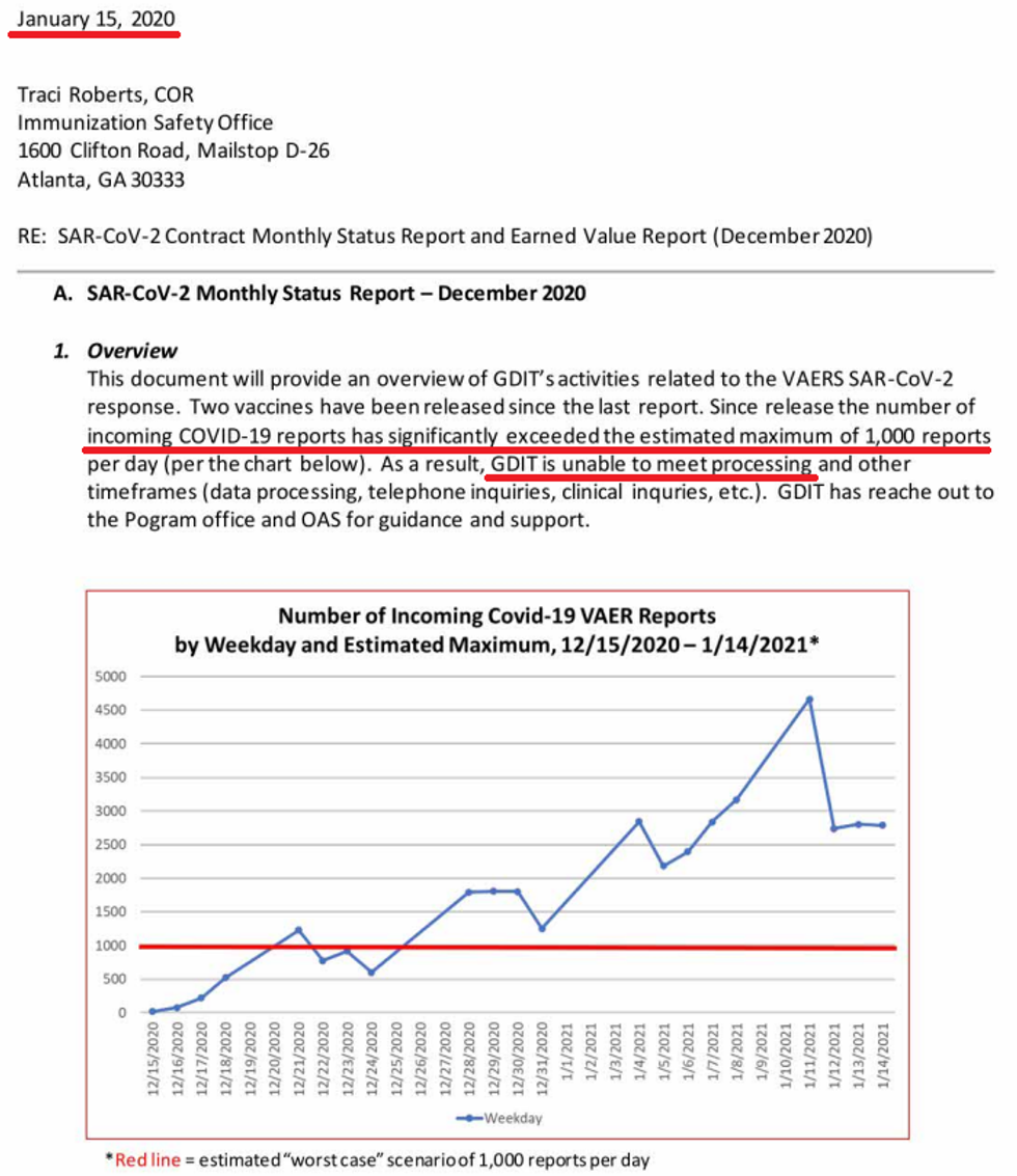 Guetzkow, who has secured numerous FOIA’ed documents both in the U.S. and Israel throughout COVID, posted 69 pages of FOIA’ed documents and contracts from General Dynamics Information Technology to the CDC’s immunization safety office. Thanks to his work, we already know from the previous FOIA’ed documents that the CDC’s $9.45 million contract with General Dynamics in August 2020 stated that officials anticipated 1,000 adverse event reports a day, with 40% of them being serious. Yet, like a cold serial killer soullessly counting his casualty list, the CDC was completely fine with going through with this campaign, as if it were the price that had to be paid to worship the spirit of the age – the modern-day Moloch. However, this document shows that as early as Jan. 15 – when most people still could have avoided these shots – the CDC was aware of record-setting reports that crushed even the agency’s initial cold-hearted, morbid expectations.