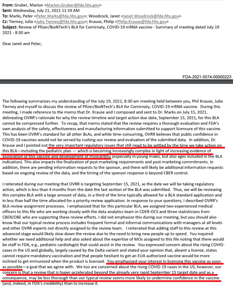 Now, keep in mind that after the government observed all these adverse events, and after officials knew about the 7.7% clinical injury rate from the CDC’s own V-SAFE program, perfectly corroborating the VAERS data, they accelerated the approval of these shots for children and then the mandates for everyone. Emails released via FOIA show that in July 2021, when the shots should have been canceled, Peter Marks, head of the FDA’s Center for Biologics Evaluation and Research, pressured Marion Gruber, then head of the office of vaccines research and review, to truncate the already accelerated timeline to fully approve the Comirnaty shot (which is still not commercially available 2.5 years later).