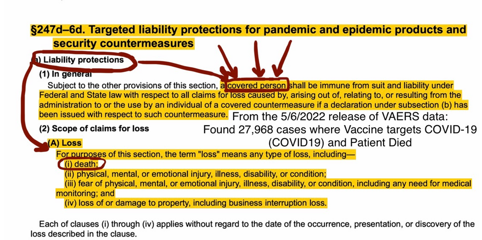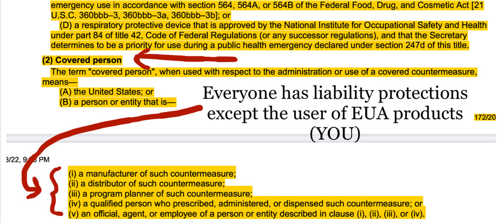 Now this would be bad enough if govenrment merely allowed private companies to manufacture products or offer treatments during a pandemic and granted them immunity. However, our government not only marketed and funded them but actually mandated them in many respects. To be fair, the statute is quite clear that emergency use products cannot be mandated: