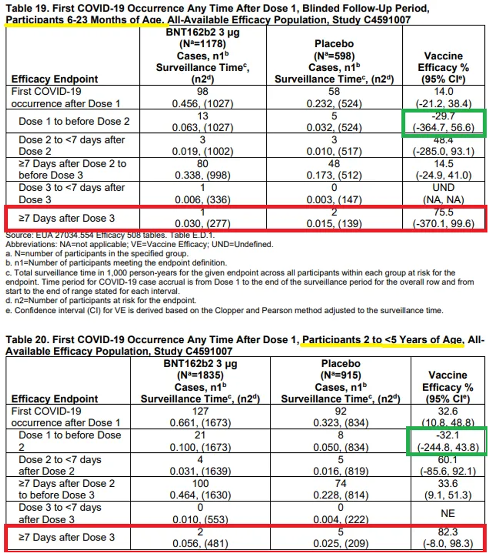 Indeed, this is nothing short of a “fourth term” abortion that would make Josef Mengele proud. Remember, Pfizer’s own data on the original series of shots for babies showed that 61% of children 6 months to 2 years old experienced a “systemic reaction within 7 days” and that 1 in 71 experienced a severe reaction. What did they get in return for assuming such risk? Straight-up net negative efficacy against COVID itself at most stages. Overall, among those 6 months to 2 years old, there were 98 reported COVID cases in the trial group and 58 in the placebo group; among children 2-5 years old, it was 127 and 92 respectively. (See p. 39 of the FDA briefing document.)