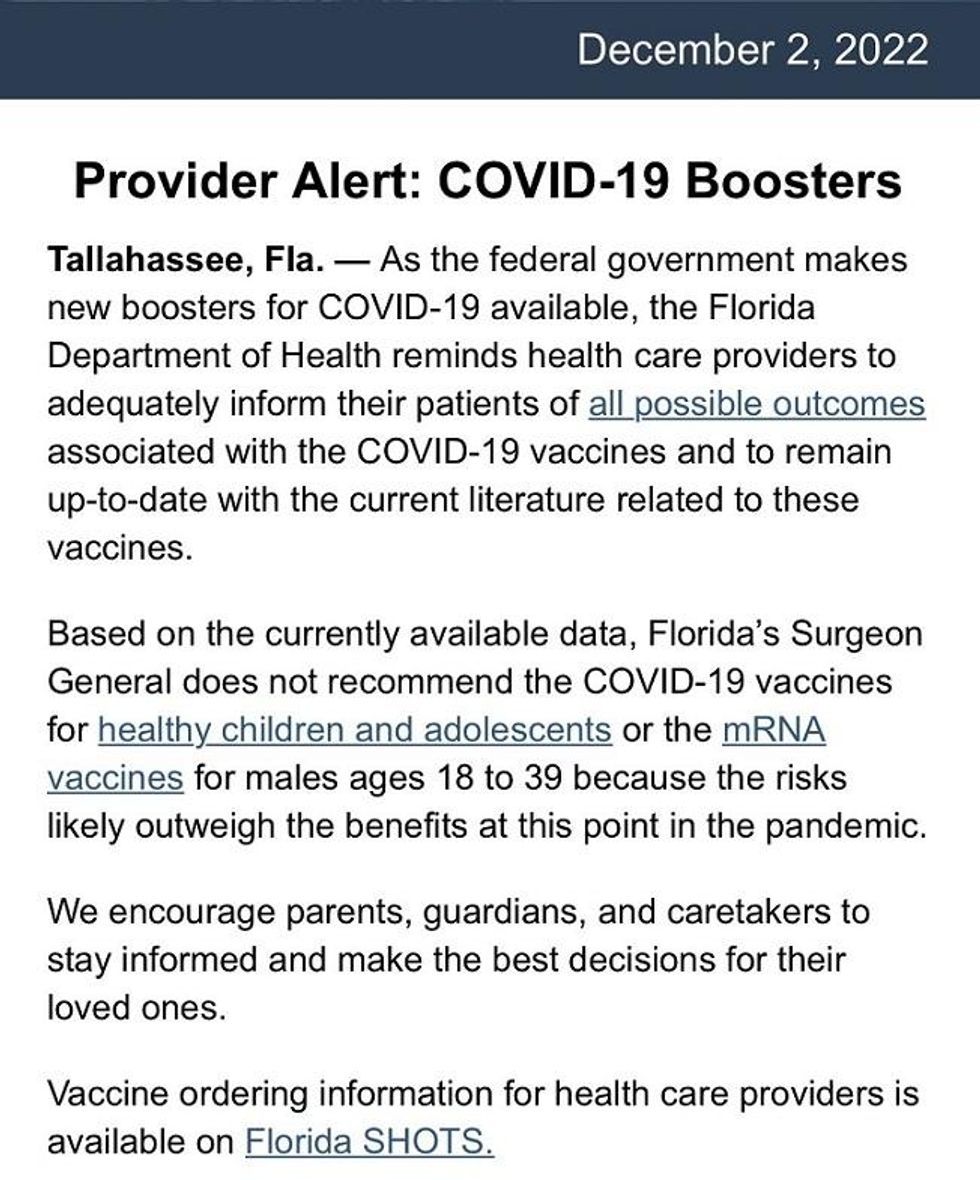 Last Friday, the Florida Department of Health sent out the following alert to the state’s health care workers. What was novel about it is that rather than promoting the boosters, as the other red states do, they warned that children shouldn’t get them and that all people should be provided with informed consent information about the risks.