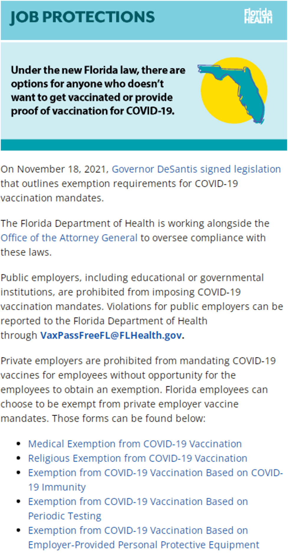 Whereas most red-state departments of health promote the boosters prominently on their websites, the Florida Department of Health promotes information on how to get out of employer mandates and ensure that employers are in compliance with the law.