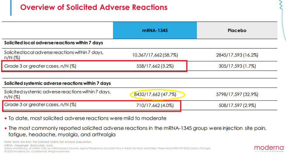 Earlier this week, Alex Berenson reported on the clinical trial data from Moderna’s mRNA RSV shot, which the company brags is 83.7% effective. It’s de ja vu all over again. Companies are able to openly report an insane level of adverse events with their own (likely contrived) trial data, yet they will get approved and promoted by the government without regulators batting an eyelash. This already happened with Pfizer and GSK’s RSV shot.