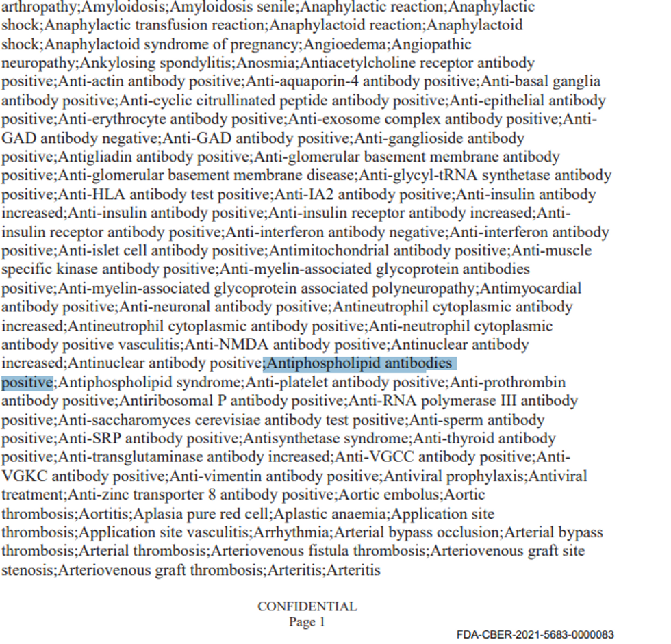 Also, aside from the mRNA concerns, the LNPs themselves contain polyethylene glycol. Many people are allergic to PEG, but even those who don’t have a direct allergy are at risk for allergies and inflammation, as PEG is designed to evade your immune system. Pfizer knew about these autoimmune disorders from day one in its infamous Feb. 28, 2021, document of over 1,400 serious categories of adverse events. One known reaction to PEG is antiphospholipid syndrome, an immune disorder that causes blood clots. A mother of one of the victims of vaccine-induced antiphospholipid syndrome was on my podcast last year. Well, it turns out that Pfizer knew about something this rare and permanently debilitating in February 2021!