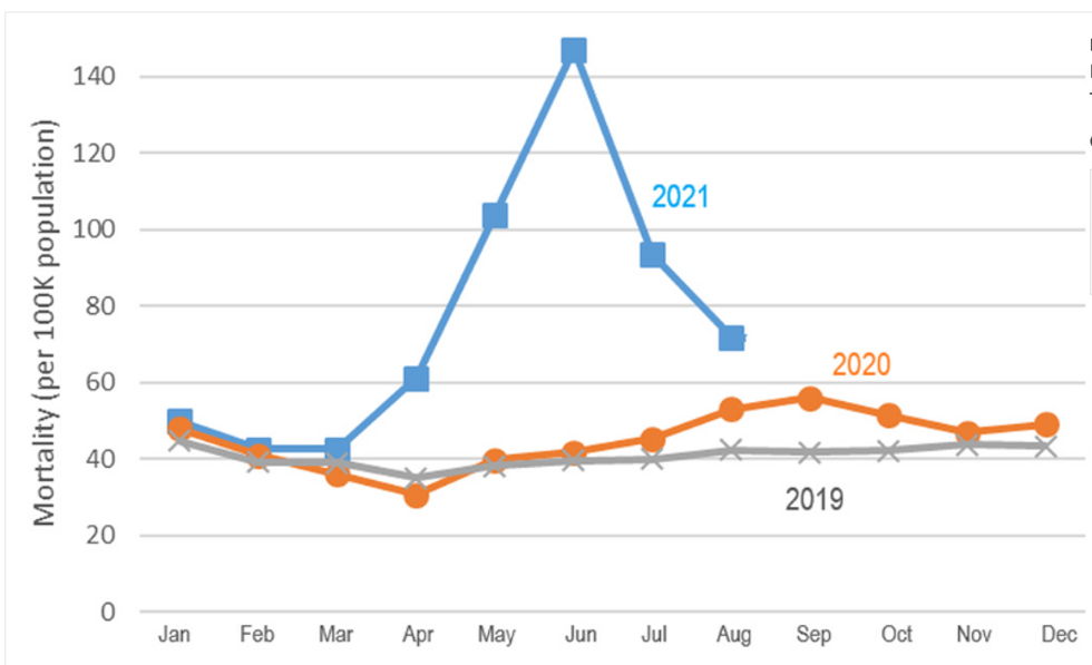According to an analysis of all-cause mortality of over 1 billion people in India, there was barely any excess mortality in 2020 before the vaccines. The mortality then exploded by over 300% in the spring of 2021, according to the analysis published in the American Journal of Tropical Medicine and Hygiene.