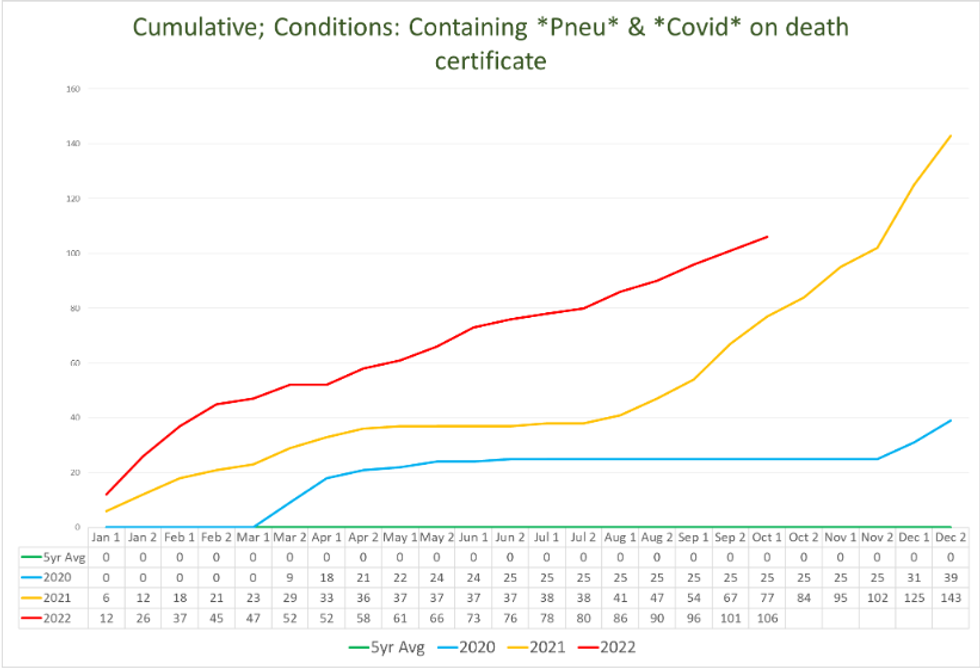 But not only are the signals for vaccine injury deaths blaring, but even the COVID deaths exploded. Although it’s hard to determine authentic COVID deaths because of government misinformation, here is a presentation of the death certificate data in Vermont among those who died of both COVID and pneumonia. That is probably the best proxy for an authentic COVID death, because someone who died incidentally of COVID usually would not have pneumonia, which was the main cause of death for COVID. You will immediately notice how deaths were much worse in 2021 and 2022 than in 2020.