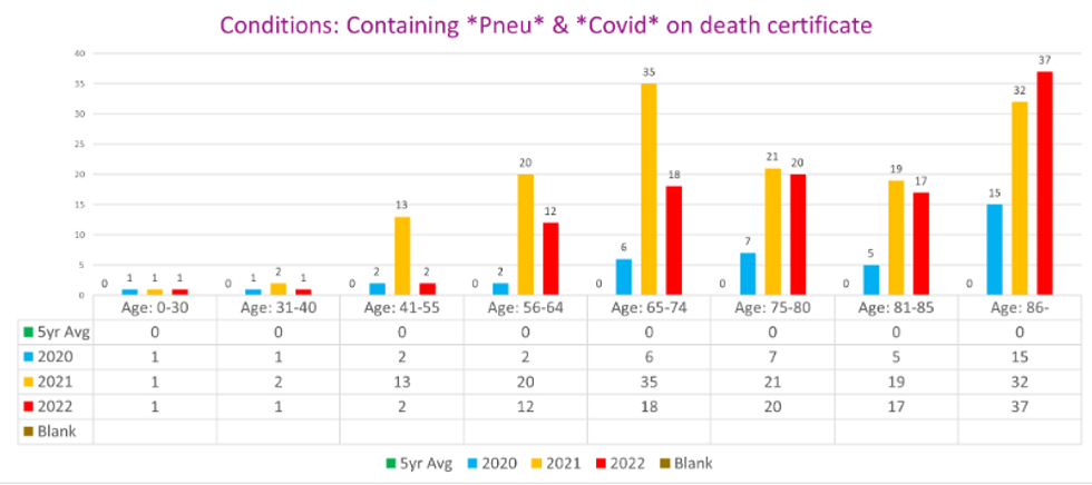 Notice how the COVID+pneumonia deaths really took off in Aug.-Sept. 2021, when nearly everyone in the state was vaccinated? And it’s still tracking high even in 2022, with very mild COVID variants. What’s worse is that the oldest age cohort, by far, is doing worse than ever now in 2022 – with the mildest variants and likely after the most shots.