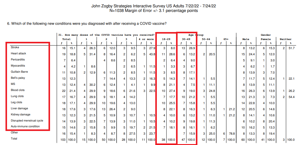 Let’s put the raw numbers in perspective. Among the 18-29 age group, a total of 127 respondents (59%) attested to having gotten one or more of the shots, and among those aged 30-49 it was 206 (60%). Now, we know that 30% of those who got the shots in the youngest group of the survey attest to having been diagnosed with a new condition within a few months. Now, one could suggest that perhaps these people are referring exclusively to lower level conditions like anxiety, allergies, or other minor ailments that are common and hard to pin on the vaccine. But if you dig into the numbers, you will find that 11 had heart attacks, 10 had blood clots, 10 had leg clots, 8 had liver damage, 8 had MS, and 5 developed Bell’s palsy. These numbers are earth-shattering because they represent a large percentage of the respondents, albeit from a somewhat modest sample size.