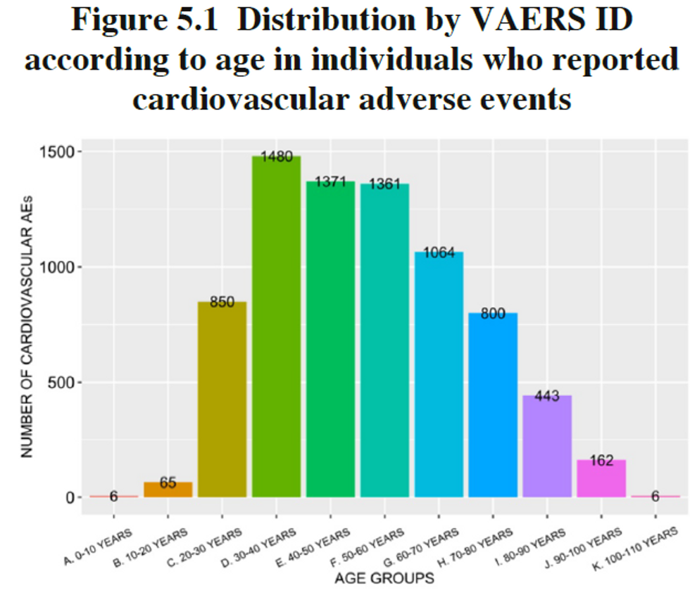 This patterns of disproportionate injury among younger people was evident from day one in VAERS. Last May, Dr. Jessica Rose, a mathematician and immunologist who has become the leading expert in VAERS, published a paper analyzing VAERS cardiovascular adverse event reporting just for the first few months of the distribution during early 2021. She found a clear bias towards the younger age groups than seniors, which lends credence to the self-reporting in this Zogby survey.
