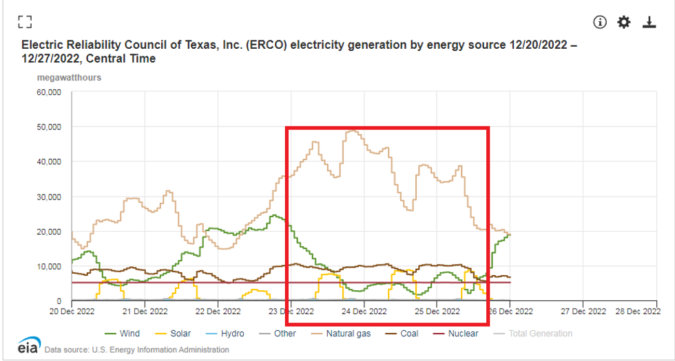 Temperatures dropped to near zero in Amarillo, Texas, over the Christmas weekend, with wind chills well below zero. Even south Texas faced several nights of once-in-a-generation record cold. Yet even with all that wind blowing, when Texans needed energy most, it was natural gas that held the grid for Texans, while wind and solar collapsed, according to the grid tracking info from the Energy Information Administration.