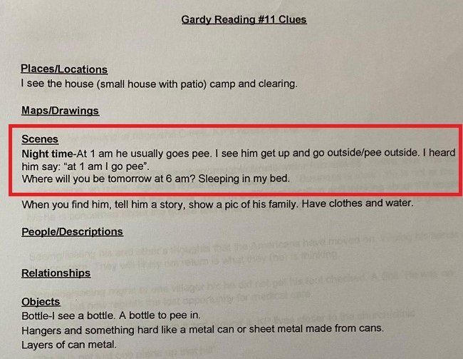 These readings have a certain logic and organization to them. They attempt to describe, often in minute detail, Gardy's current location, his captors or other villains, and landmarks or other noteworthy objects that might signal to OUR team members that they are on the right track. The readings also make several references to the Bible and the Book of Mormon, likely to fortify the resolve of those looking for Gardy.