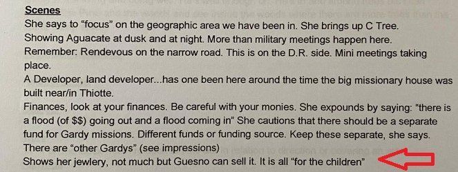 Yet another reading with Illienne features a detail that — when read with the knowledge that Gardy remains missing and that OUR has been raising sometimes hundreds of thousands of dollars at a time off of Gardy's story — is quite unsettling. At the prompting of Illienne's spirit, Russon advises Guesno Mardy to sell the jewelry that once belonged to his late mother to help fund "Gardy missions." "It is all 'for the children,'" Russon writes.