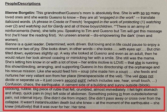 In many readings, Russon also communes with the spirit of Gardy's deceased relatives, especially Illienne Borgelin, Gardy's paternal grandmother and the mother of Guesno. Illienne, spelled with one L in some readings, died in the deadly earthquake that hit Haiti in January 2010, just a few weeks after Gardy was kidnapped. During one reading, Russon, channeling Illienne's spirit, appears to experience for herself Illienne's supposed final moments: