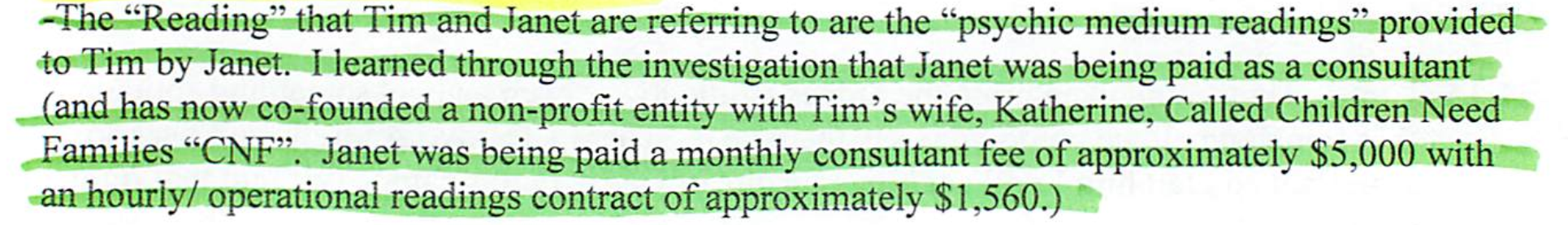 Janet Russon worked as a full-time executive director for the Children Need Families program for the last two years with a starting salary of $122,000 per year and a final salary of $125,000 per year. She left O.U.R. shortly after Mr. Ballard’s departure. None of her work with CNF had any association with her self-proclaimed psychic abilities. For any question about her alleged psychic abilities, services rendered to Mr. Ballard, or payments for those services, please ask Ms. Russon or Mr. Ballard.