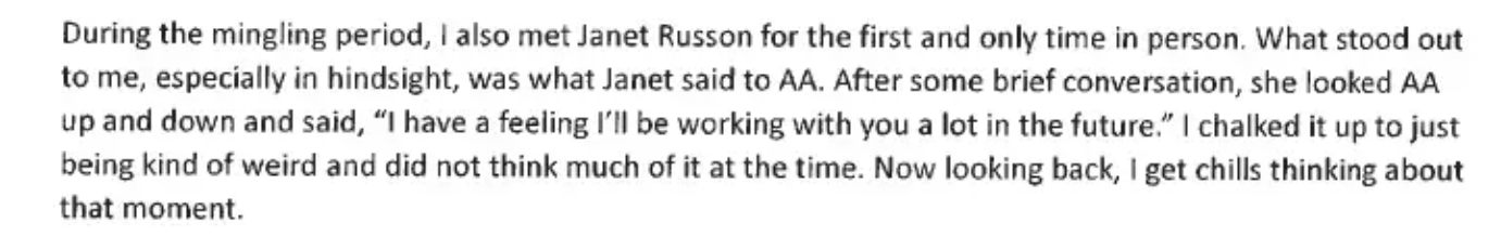 An investigator wrote in a report given to DA Rawlings his own understanding of Russon's pay structure. "I learned through the investigation that Janet was being paid as a consultant," the investigator wrote.