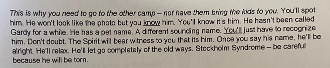 Another time, Russon writes in bold that she'd heard Gardy say, "Just go to the camp. See you at the camp. I'll be there." Whether ops team members ever reached a camp is unclear, but if they did, they did not find Gardy there.