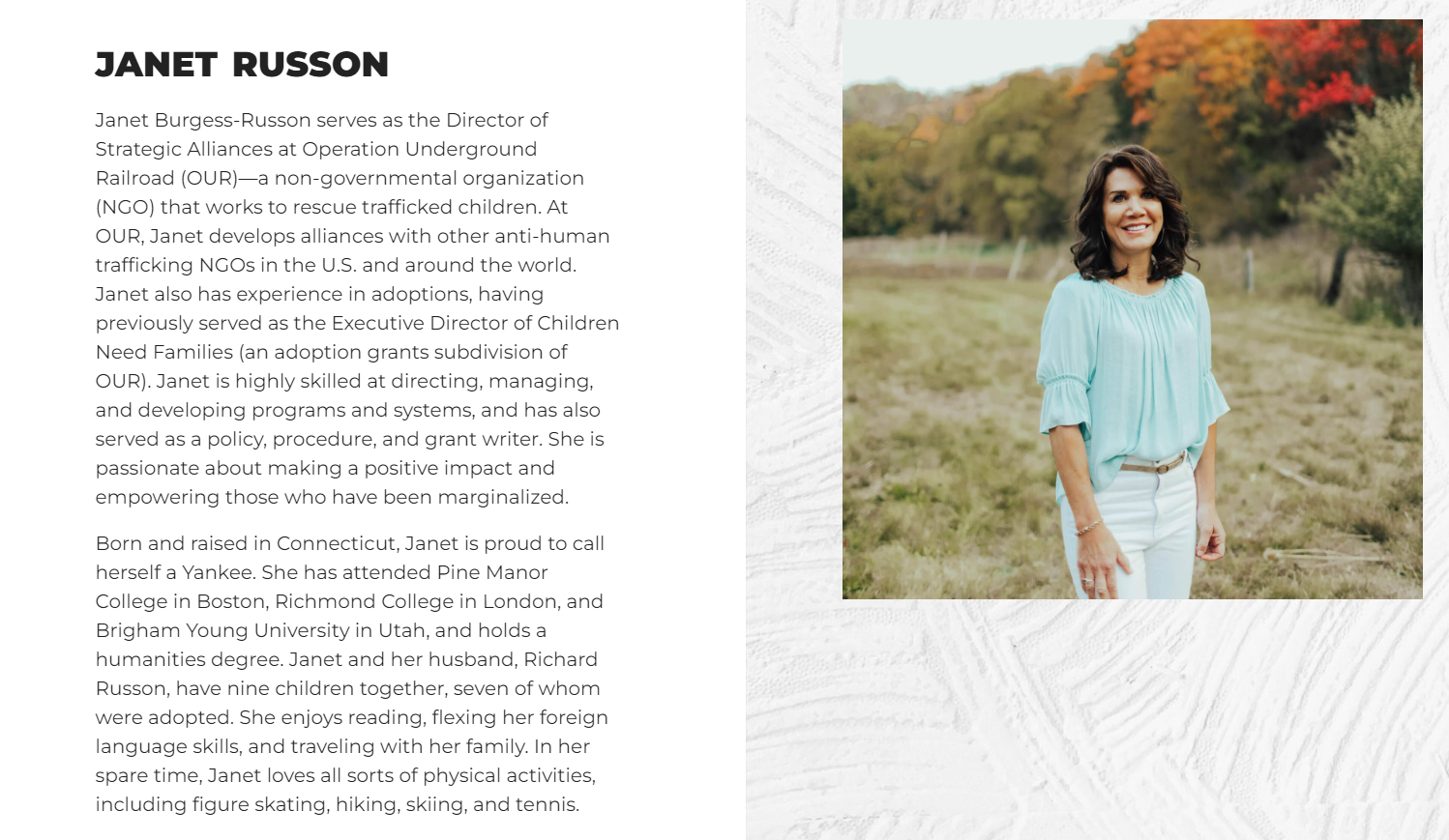 According to a statement from OUR included at the end of this section, in 2021, Russon was named the executive director of Children Need Families, then an OUR subgroup co-founded by Ballard's wife, Katherine Ballard, that focused on providing prospective adoptive families with financial assistance. It is unclear what experience Russon may have had that would have qualified her to act as executive director of a nonprofit organization.