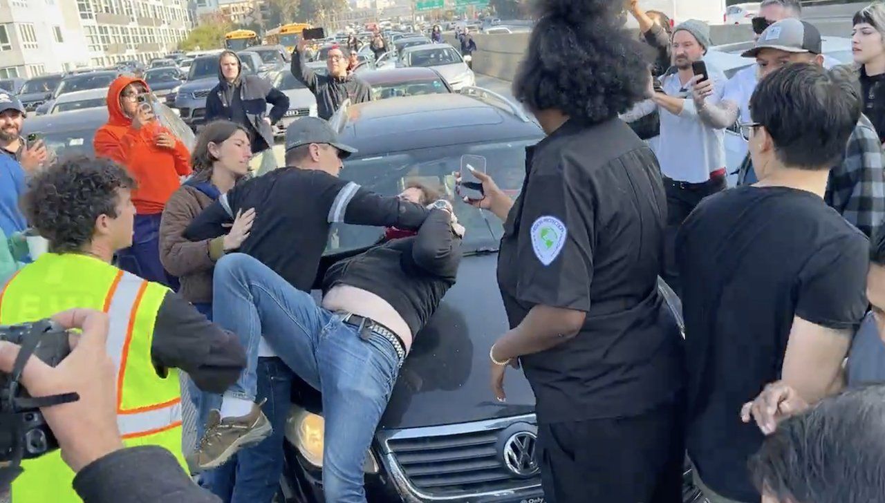 In the below video, motorists are seen grabbing protesters' signs and tossing them away, dragging them from the line they formed stretching across the freeway lanes — and one driver is seen wrestling a protester on the hood of a car before knocking him to the freeway surface.