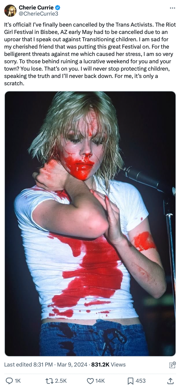 Check out what Cherie Currie — now 64 years old and still hitting the stage — posted Wednesday night on X: