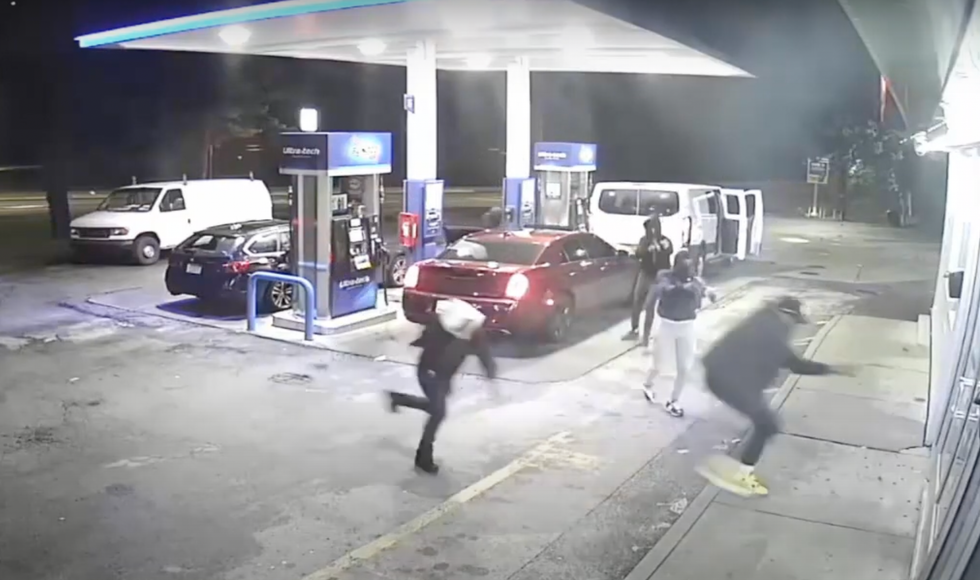 Three other crooks armed with rifles and handguns also emerged from the van, and all four gunmen chased the victim, who ran into the gas station's store.