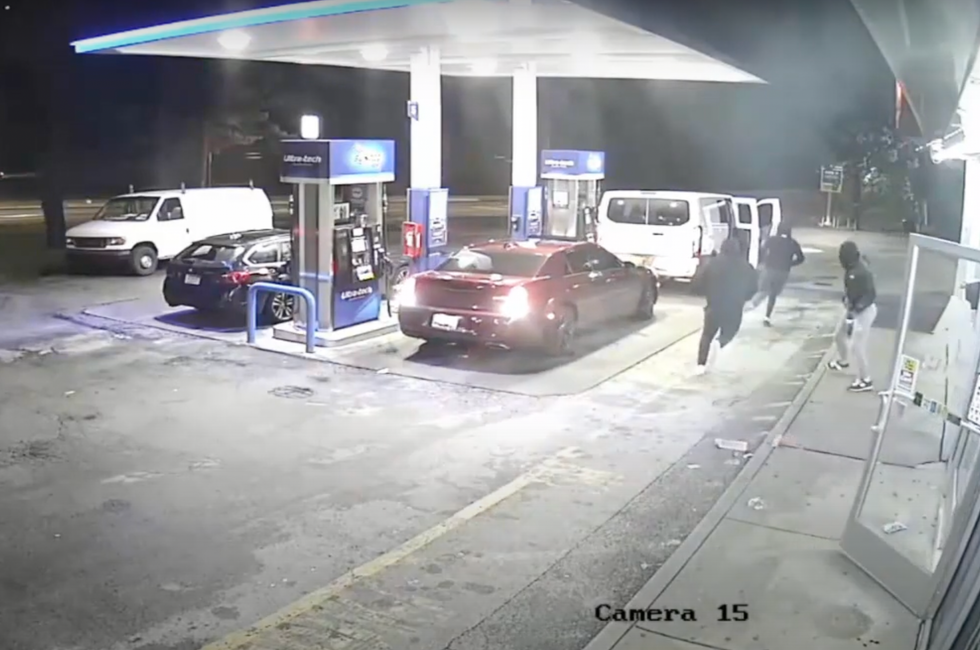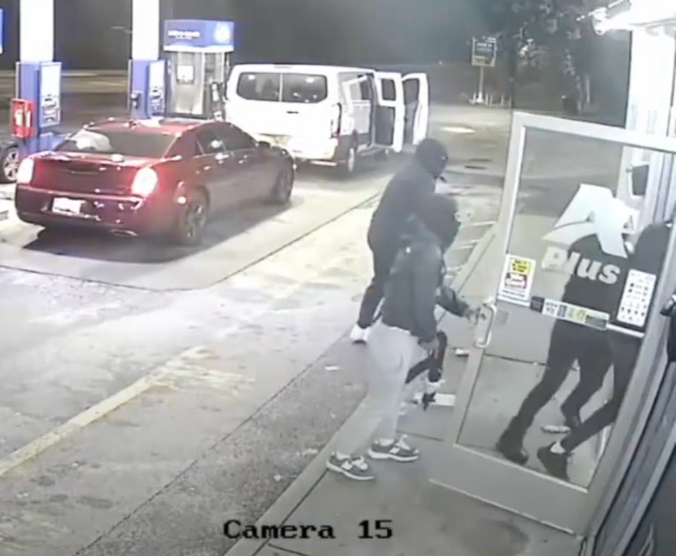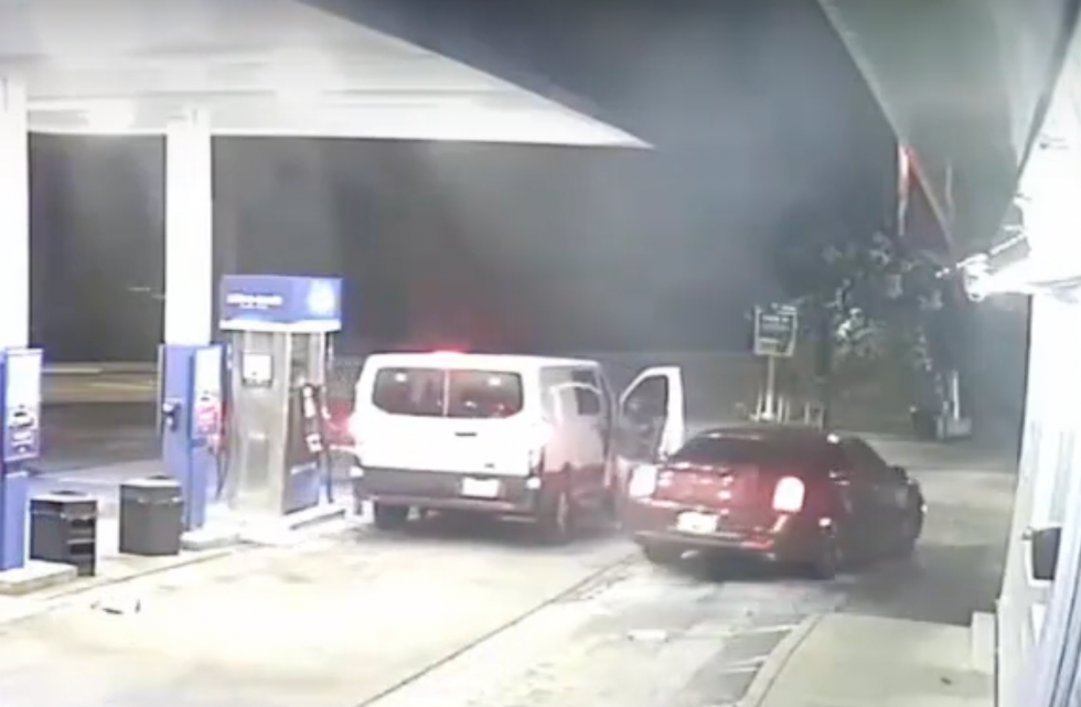 At least one of the crooks had a flair for the dramatic, hopping out of a white van parked in front of the targeted car — a red 2022 Chrysler 300 — jumping on the car's roof, and pointing a gun at the car's owner, who appeared to be about to begin pumping gas.