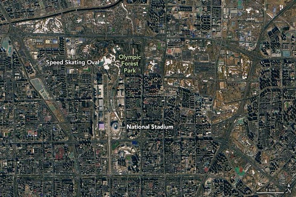 "The output from those machines was easy to spot in satellite imagery of the area," remarked NASA. "On January 29, 2021, the Operational Land Imager (OLI) on Landsat 8 captured an image of the downhill trails covered with artificial snow. The water used to make the snow gets piped in from the nearby Foyukou and Baihepu reservoirs."