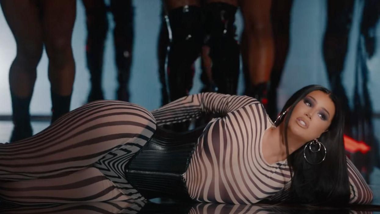 In the video, the normally blonde Azalea swaps her flaxen locks for a dark wig and dramatic eye shadow while wearing a sheer, full bodysuit and leather corset.
