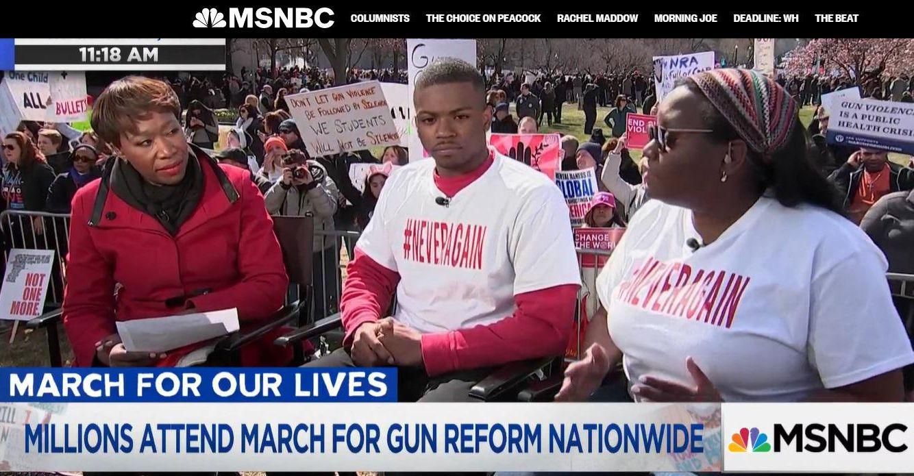 A video of Brown's appearance with Reid was recirculated on Twitter by Chuck Ross, a reporter for The Washington Free Beacon, with the caption: "The Louisville activist who shot a mayoral candidate appeared on Joy Reid’s show at an anti-gun violence rally. Said he 'loves' David Hogg."