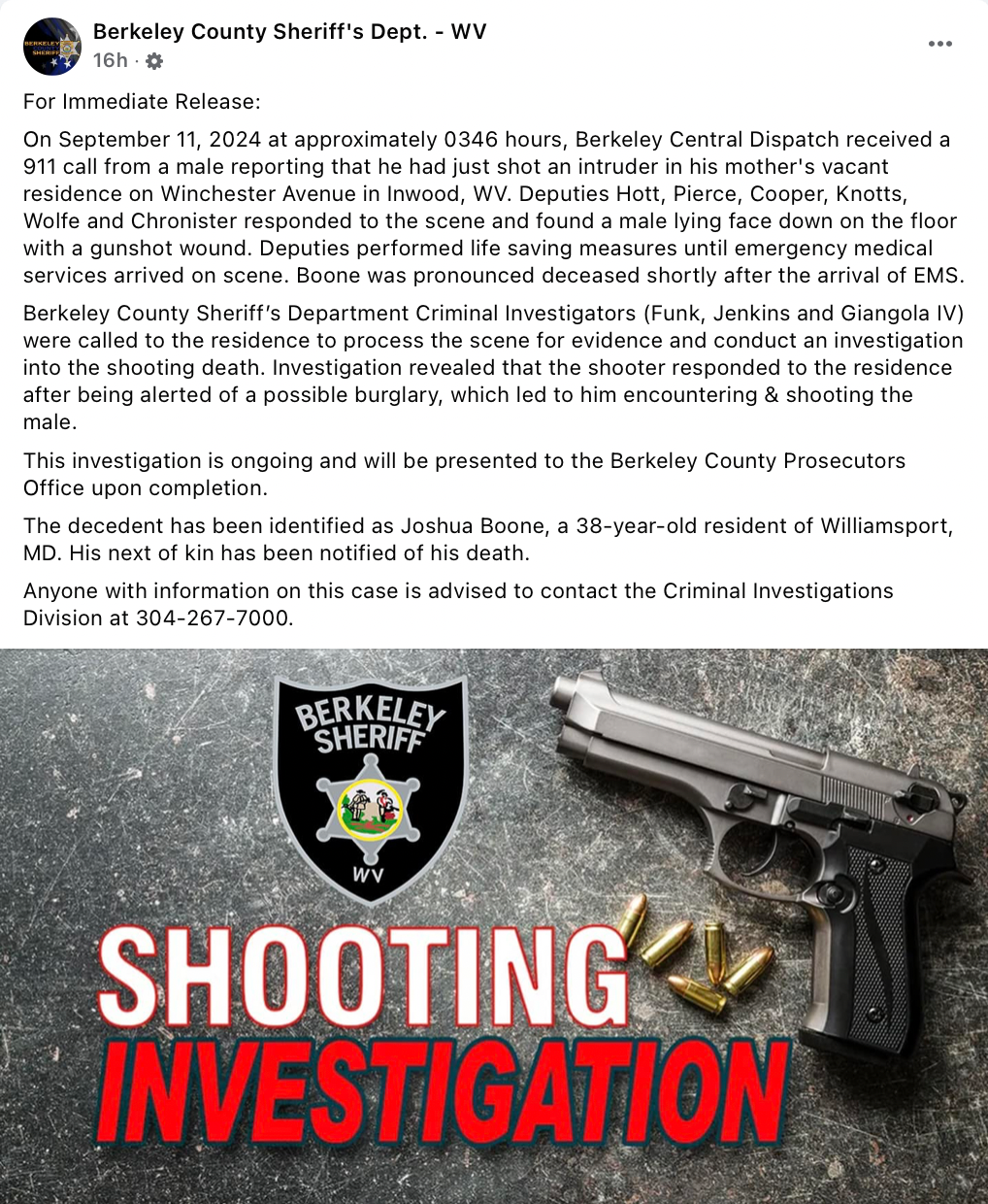 The alleged intruder he shot was identified as 38-year-old Joshua Boone of Williamsport, Maryland.