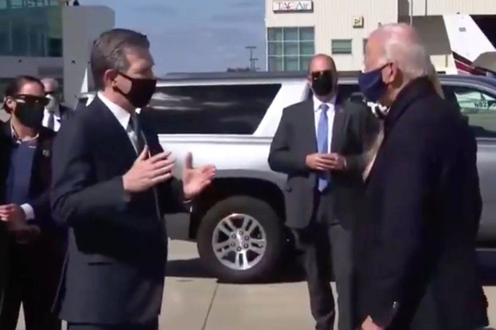 "Thanks for coming out, you didn't have to do this," Biden said in the video as they are both wearing masks.