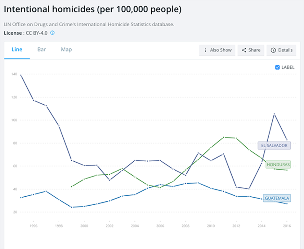 Either way, all of the countries have been trending down in violence, exactly coinciding with the border surge. In fact, migrants are more likely to experience violence on the trip to America, thanks to the “compassion” of our open borders magnet, than they are in their home countries.