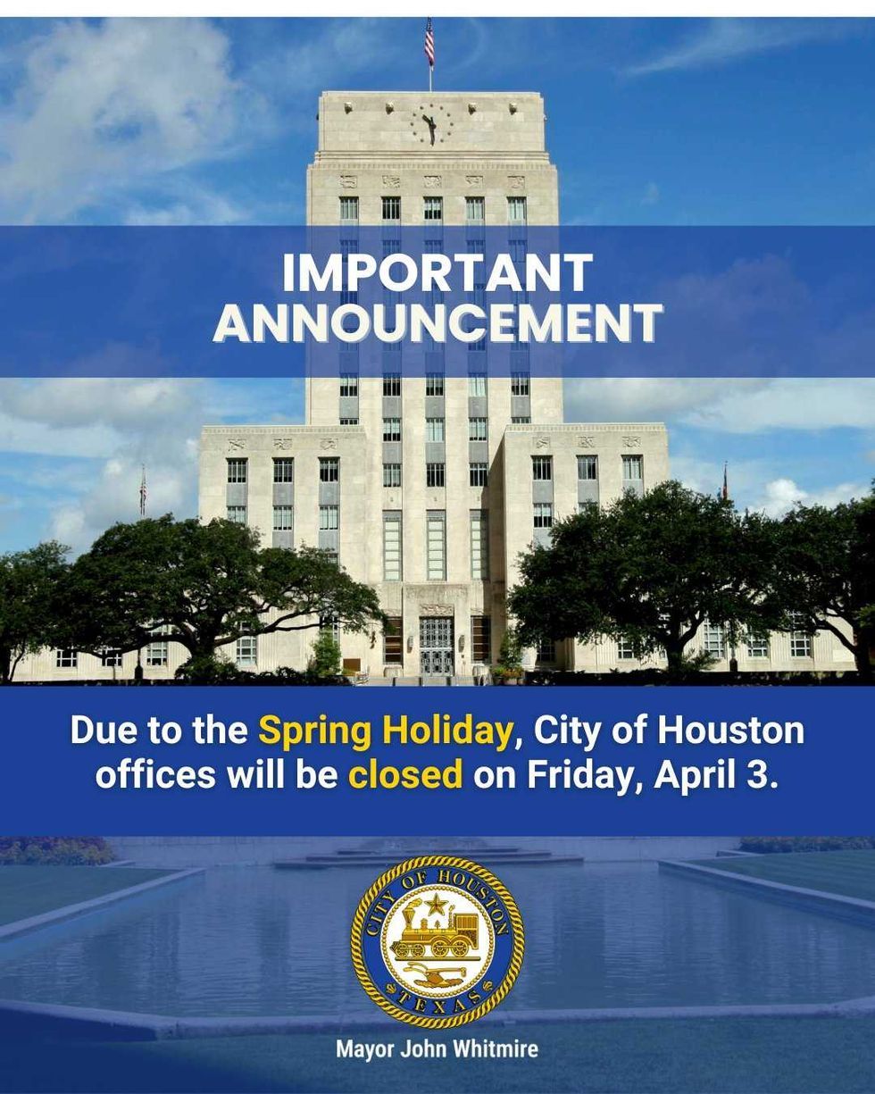 In an otherwise unremarkable announcement, the city said, "Due to the Spring Holiday, City of Houston offices will be closed on Friday, April 3."
