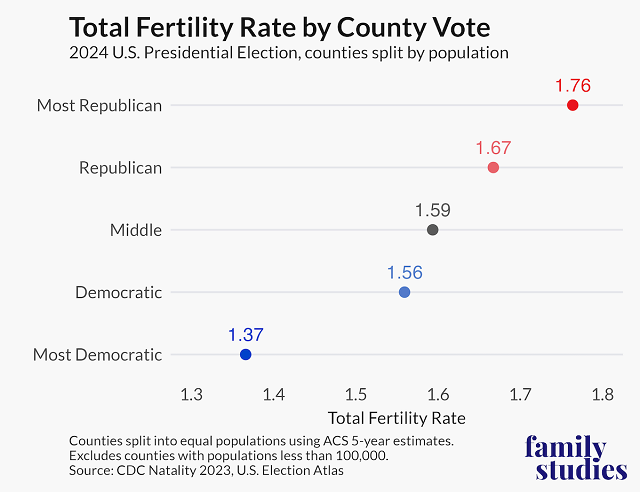 In the Barack Obama vs. Mitt Romney era of 2012, there was an 8% fertility difference between red and blue counties. According to the IFS, that difference has more than tripled to a 26% difference in 2024.