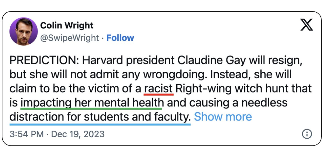 In a December 19 tweet, Wright perfectly predicted the manner in which former Harvard President Claudine Gay would resign:
