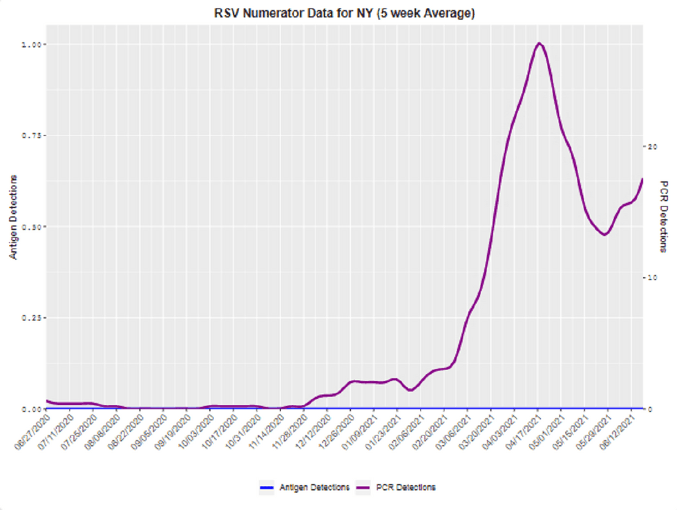Likewise, the re-emergence of viruses like RSV, coronavirus colds, and parainfluenza off-season during the spring coincides with COVID cases dropping like a rock, not the lack of mask-wearing. For example, while many southern states ended the mask mandates in the early spring, New York only recently ended it, and most people still wear masks indoors in the northeast. Yet the CDC's data on RSV show the resurgence beginning early in the year – exactly when COVID started to decline.